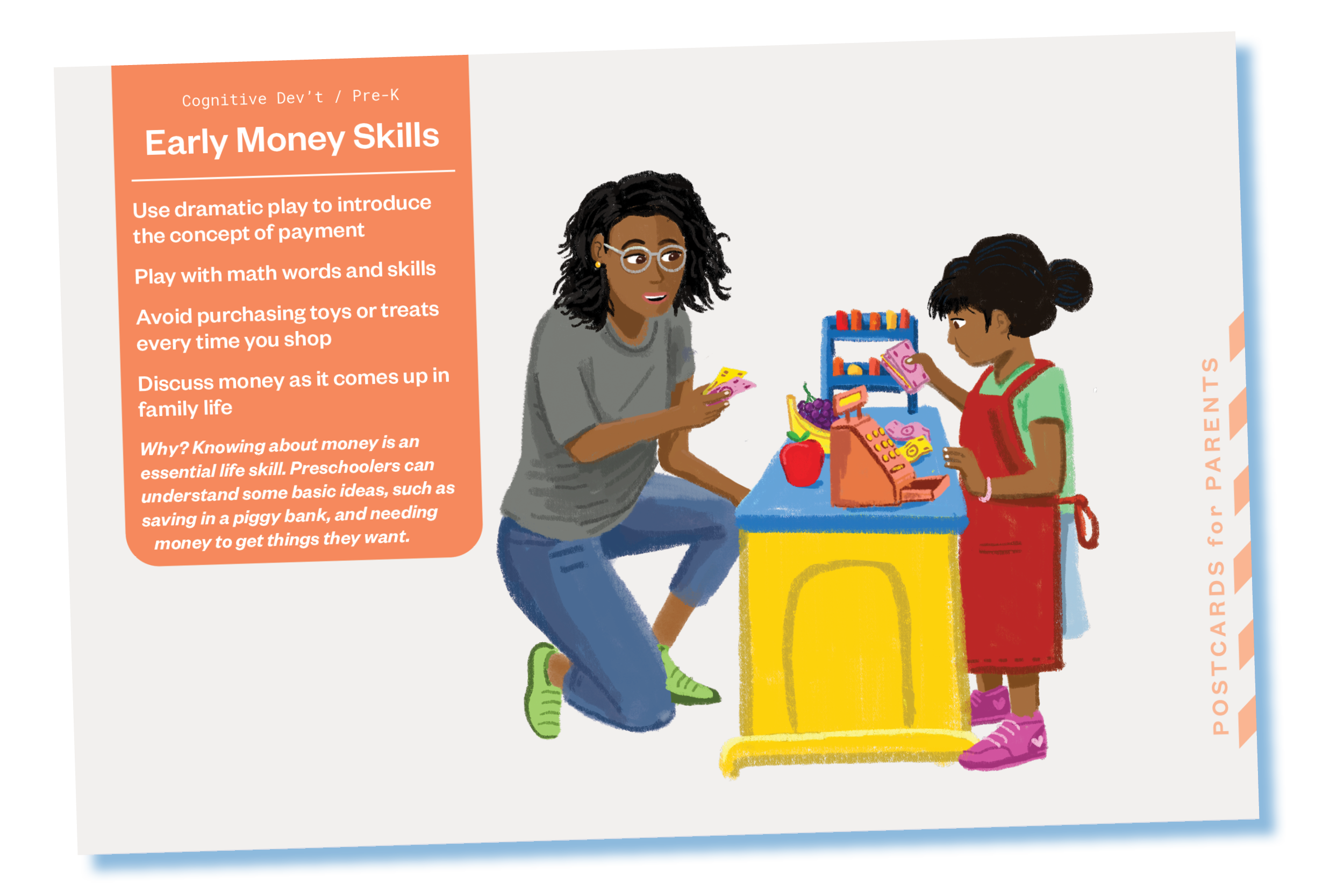 In the early years, introducing math concepts such as more and less (so they can later understand the value of coins and bills), counting, and the idea of the need for currency to purchase goods and services is a great place to start.