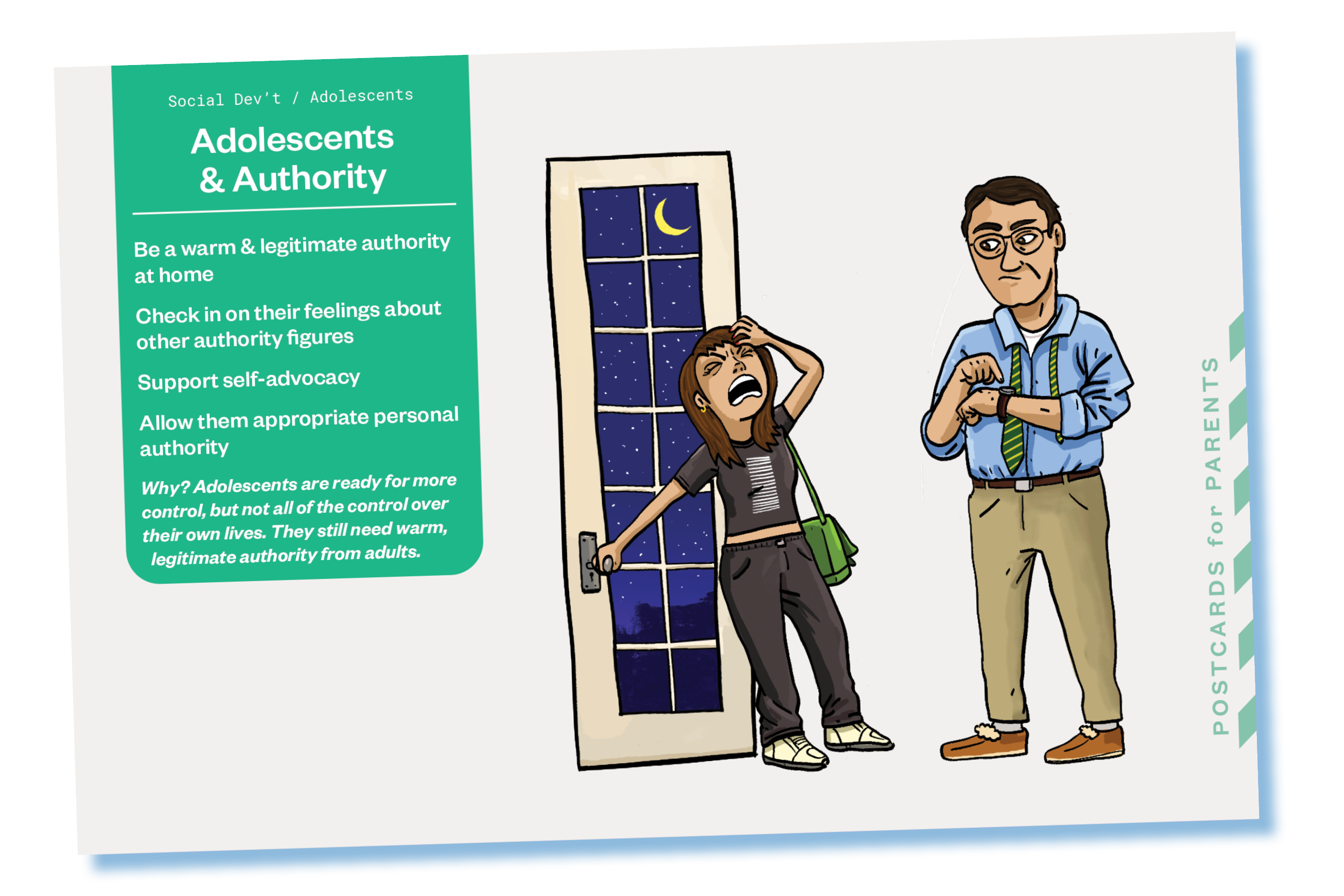 Authority – Even if they push against it, adolescents still need a caring adult be the "grownup in the room." Kids' anxiety goes up when the adults around them do not have authority, because on some level kids know they're not ready to manage things. This can be particularly important in the adolescent years, as the amount of personal authority shifts. They’re ready for more control not all of the control over their own lives.